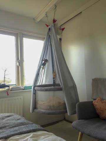 Ich lebe in den Niederlanden, hier haben fast alle Häuser – so wie unseres – zwei bis drei Etagen, da hilft etwas, das sich leicht von Stockwerk zu Stockwerk mitnehmen lässt. Wir mussten nur kurz überlegen, wie wir die Wiege im Schlafzimmer befestigen, weil wir dort eine abgehängte Decke haben.